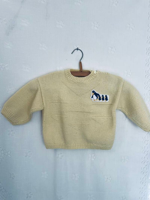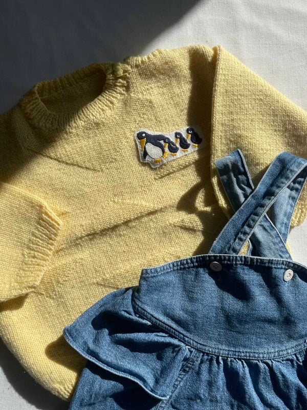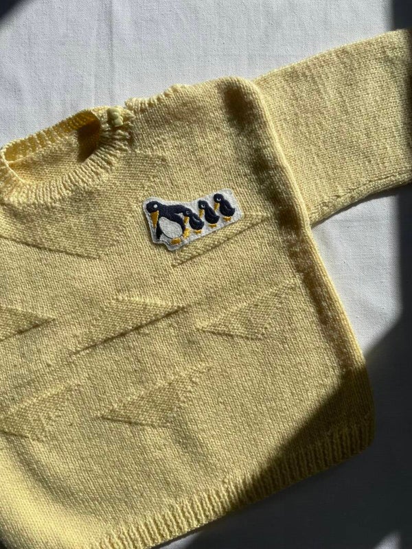 Schattig zacht geel baby truitje handgemaakt met knoopjes op de schouder. Voor kleintjes rond 1 jaar.