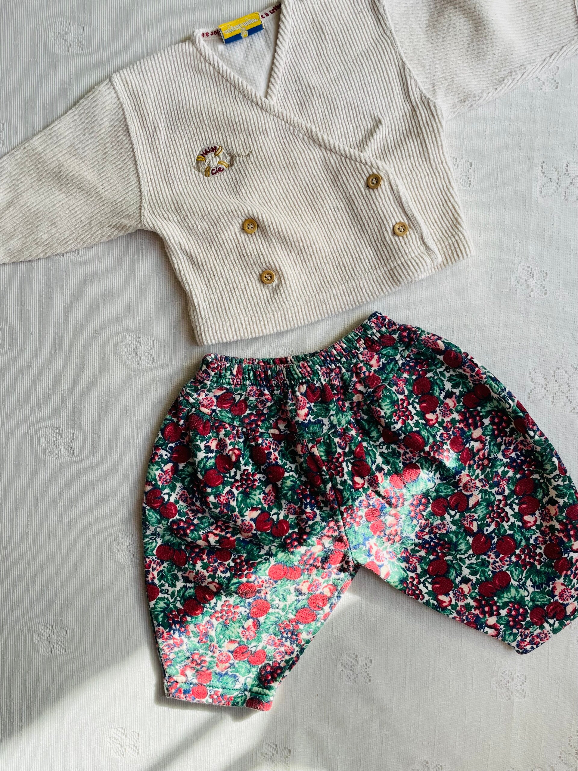 Vintage baby setje vestje kersen besjes pofbroekje 6m