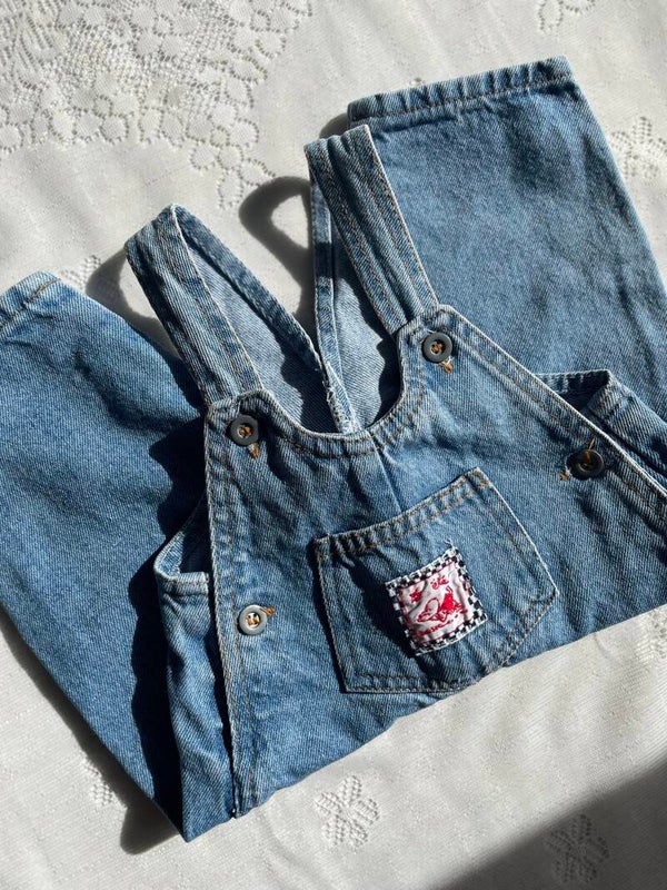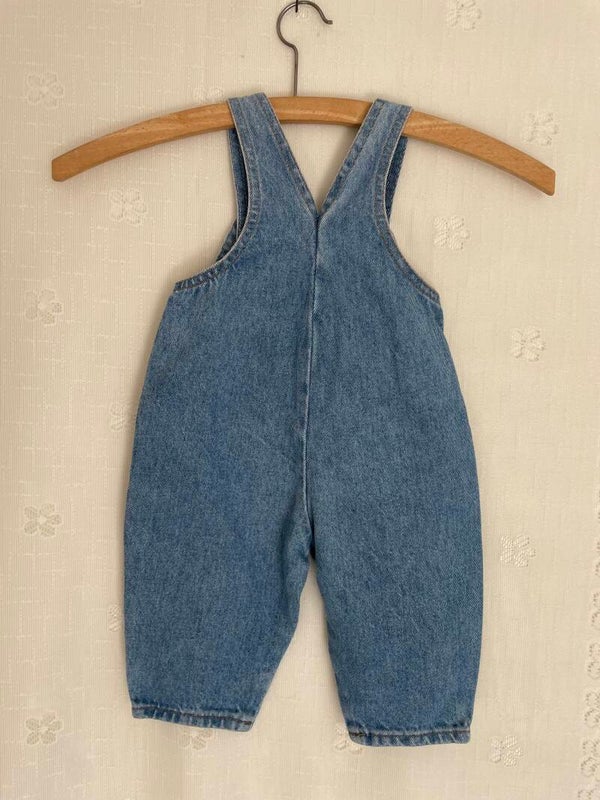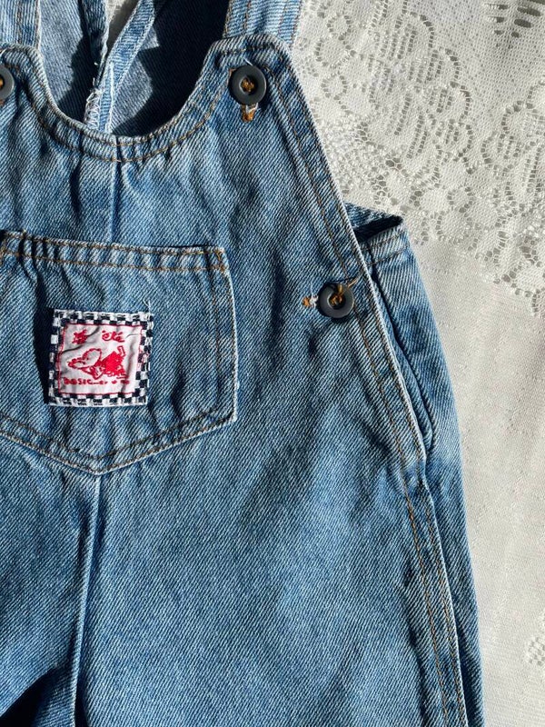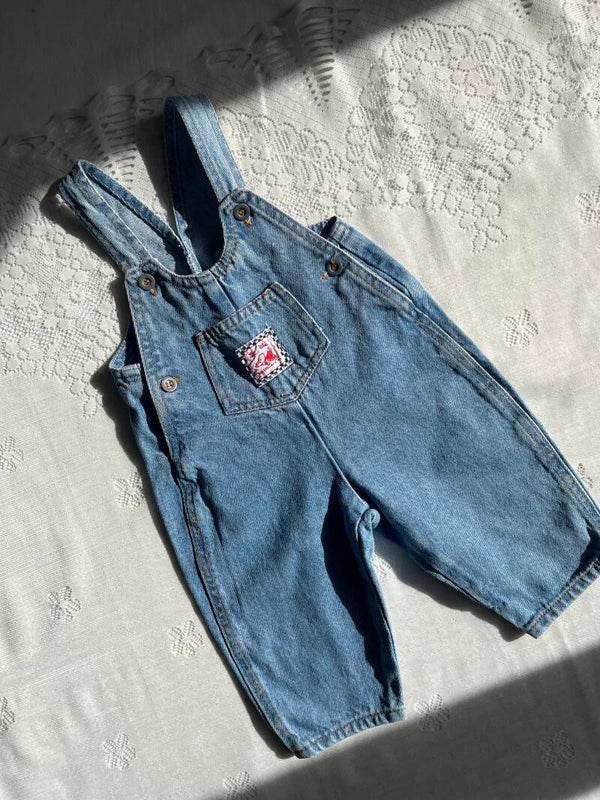 Schattig vintage lightdenim tuinbroekje voor een kleintje van 6 maanden.