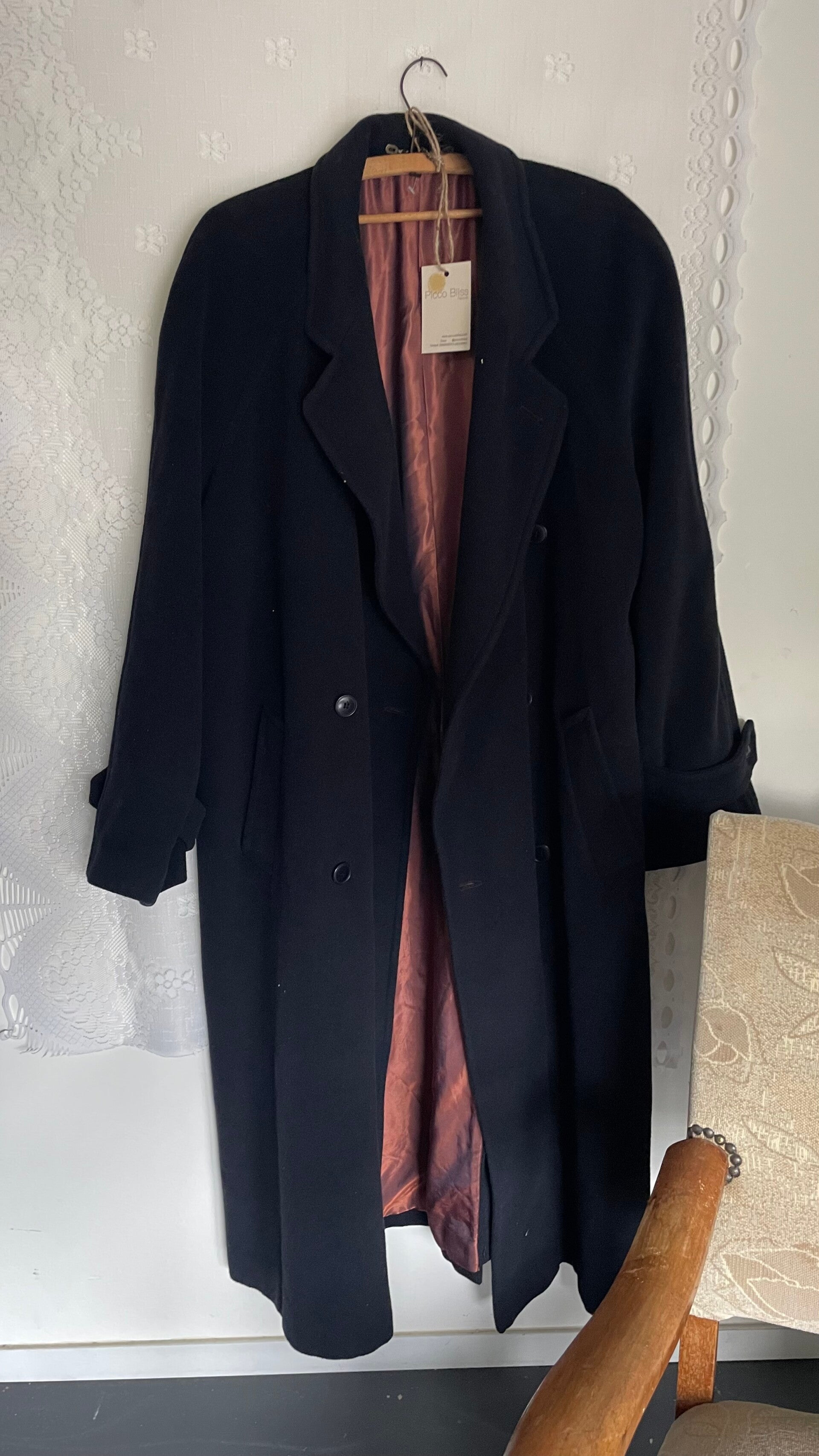 Prachtige wollen vintage oversized jas met cashmere. Zwart blauw