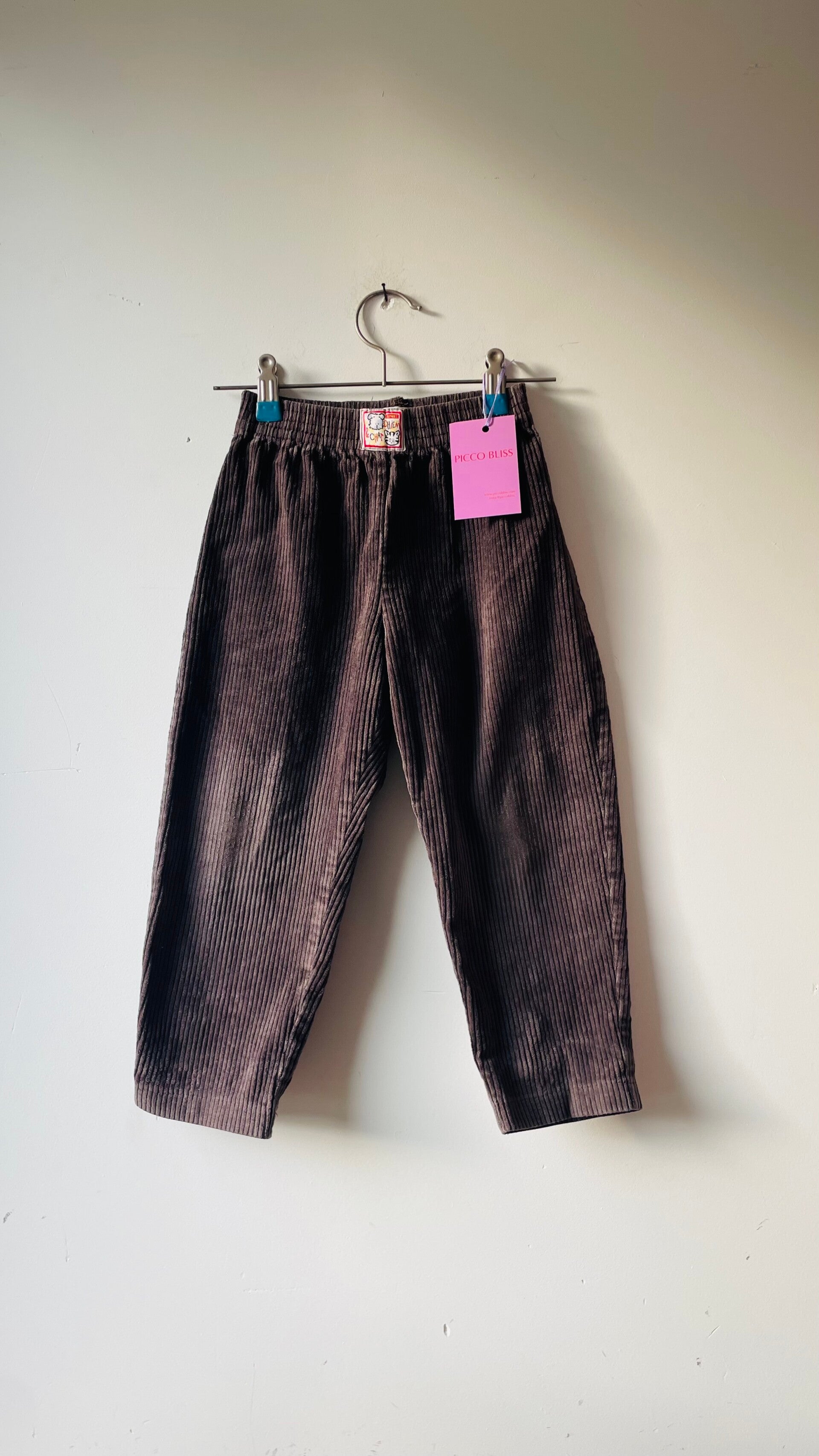 Bruine corduroy broek rib stof. Schattig pofmodelletje.